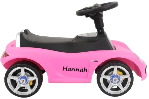 Personaliseer de roze Porsche Carrera GT loopauto met een eigen naam! In deze set ontvang je twee zwarte naamstickers die je naar wens op de zijkanten van de loopauto kunt aanbrengen. Vul een naam in van maximaal 10 karakters en maak de auto helemaal uniek. Je ontvangt een duidelijk stappenplan voor het eenvoudig aanbrengen van de stickers.